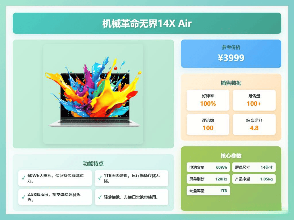 屏幕方面,2。8K分辩率搭配120Hz刷新率,色彩显示也很到位,视觉体验相当棒。并且亮度也脚够高,即便正在光线比力亮的下,也能看得清晰。再加上升级的散热架构和定制电扇,散热结果杠杠的,能够持续不变输出,不会等闲掉链子。这台机械14X Air笔记本电脑,实的挺让人面前一亮!它采用AMD锐龙7 H255处置器,搭配Radeon 780M核显,机能杠杠的。再加上32GB的LPDDR5X高速内存和1TB的PCIe 4。0固态硬盘,运转速度那是相当流利,辞别卡顿,体验感UP UP!
