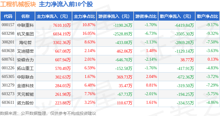 从资金流向上来看,逛资资金净流出1。24亿元,散户资金净流入2。06亿元。工程机械板块个股资金流向见下表。